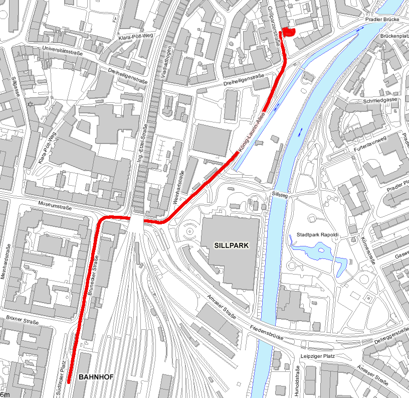 - am Einkaufszentrum Sillpark links vorbei in die König- Laurin-Allee